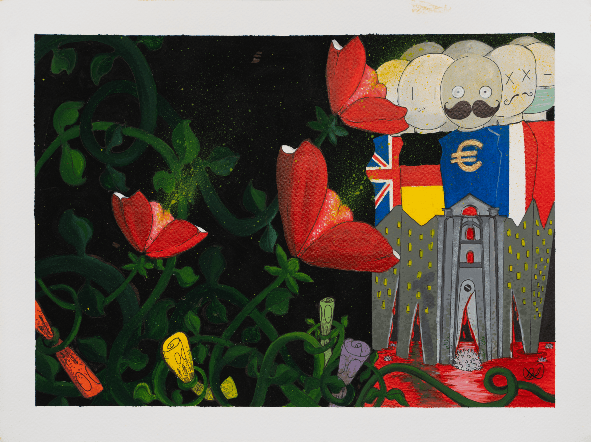 Questo quadro, realizzato durante il periodo della chiusura totale dovuta alla pandemia di COVID-19, si presenta come una potente allegoria visiva della crisi globale e delle sue dinamiche più oscure. A sinistra, l’occhio dell’osservatore viene catturato da una pianta infestante dai tratti inquietanti: i suoi rami si attorcigliano attorno a delle banconote, suggerendo una natura parassitaria del denaro, che prospera soffocando ciò che lo circonda. Dal suo fiore rosso, simbolo di inganno e attrazione mortale, emergono lingue che diffondono spore: un chiaro riferimento alla diffusione della disinformazione, della propaganda o dell'influenza tossica del potere economico.
